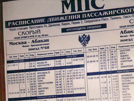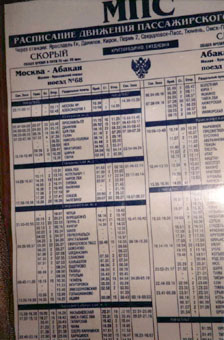 Rychlík Moskva – Abakan jede každý den a má 56 spacích vagónů. Cesta trvá čtyři a půl dne. Jízdní řád je nejoblíbenějším čtivem a předmětem hovoru cestujících. Konzultují mezi sebou posun časových pásem, zpoždění a hlavně „přestávky“. Po 6–8 hodinách vlak většinou stojí 20–40 minut ve stanici. Je to příležitost se protáhnout, projít, nakoupit čerstvé jídlo a pití...