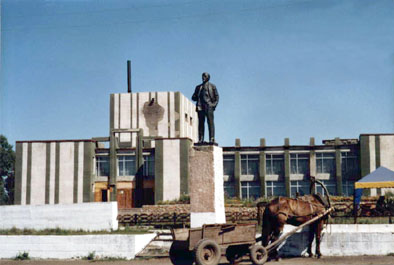Typický obrázek náměstí v bezejmenné vesnici: všudypřítomný Lenin, v pozadí unifikovaná budova místního sovětu a v popředí středověký koňský povoz.