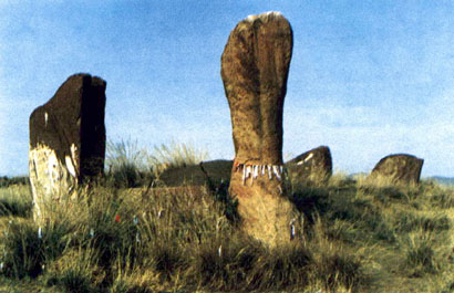 Cíl našeho výjezdu do stepi – menhiry, které stojí kolem pohřebních pahorků v chakaské stepi od 3. st. př. n. l. Mašličky se vážou na každém posvátném místě.